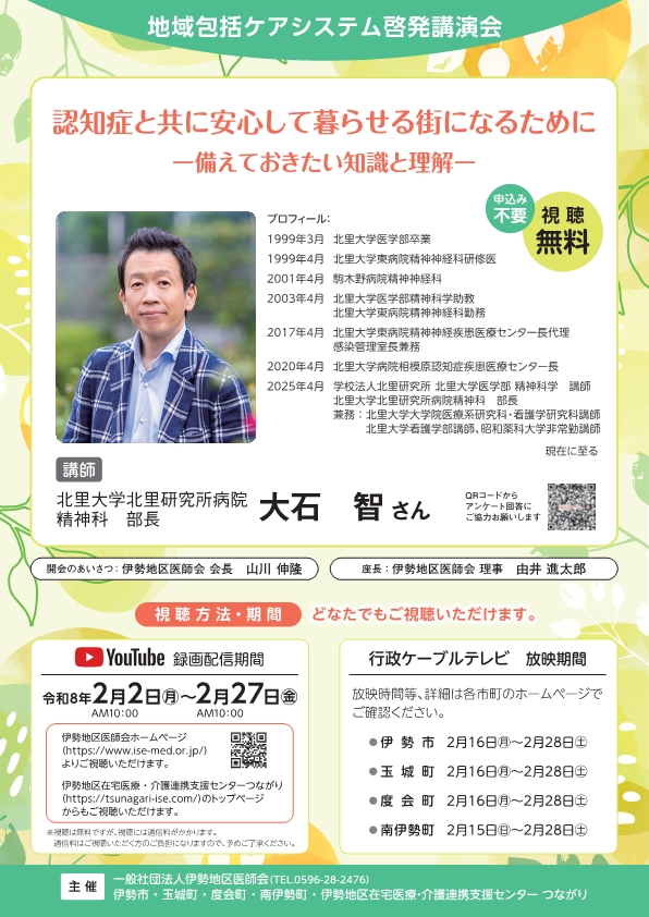 ※同講演会は、伊勢市、玉城町、度会町、南伊勢町、一般社団法人伊勢地区医師会、伊勢地区在宅医療・介護連携支援センターつながりが共同で開催します。